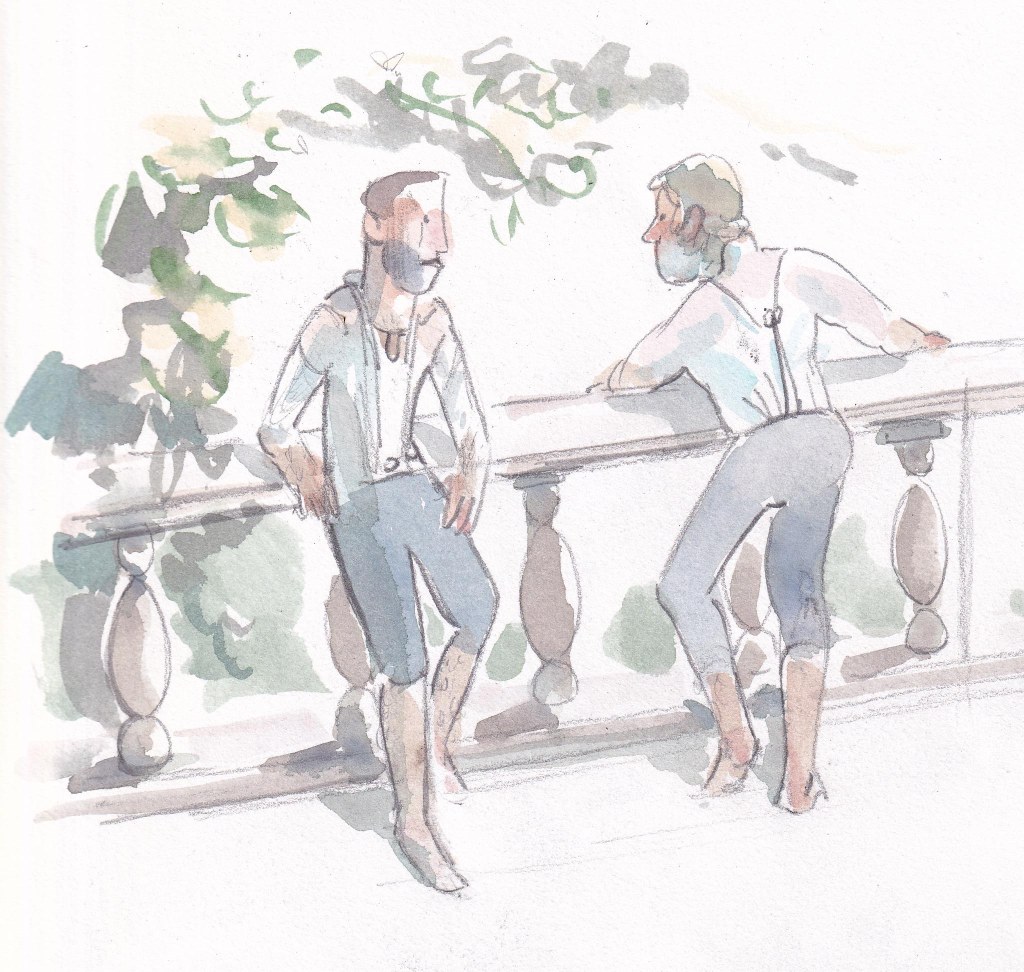 I’ve worked up these from sketches to capture a part of the day. They were completed using pencil then some pen and ink before using a broad gum tape to stop the paper warping when I applied watercolour and inks. Usually I stretch wet paper first before inking and painting but I found this worked well with cartridge paper.