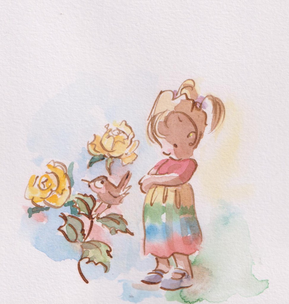 I’ve used watercolours and pencil on stretched heavyweight cartridge paper deciding not to ink in lines because I like the softness overall of the line and the colours.
