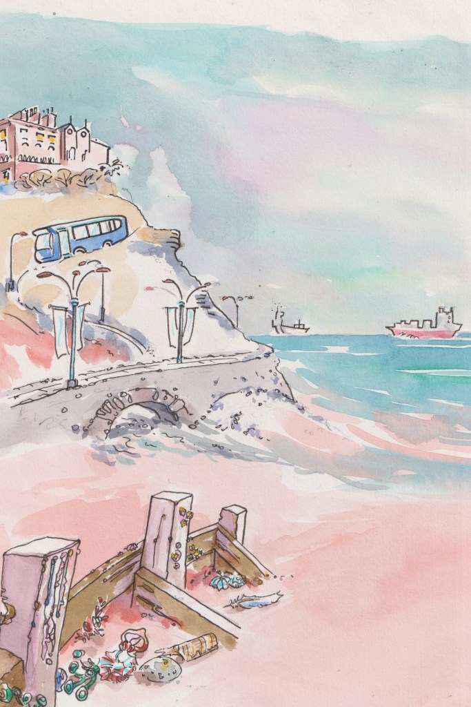 I loved drawing the different designs for the cover especially whilst cat sitting in Lasswade. Ronin (Cat) has a Siberian wild look to him and I think that helped. It was important to both of us to capture the shoreline of Saltburn in North Yorkshire. Also more recently a Sealion has been popping up to watch the folk on the pier.. it does turn very cold in Winter.