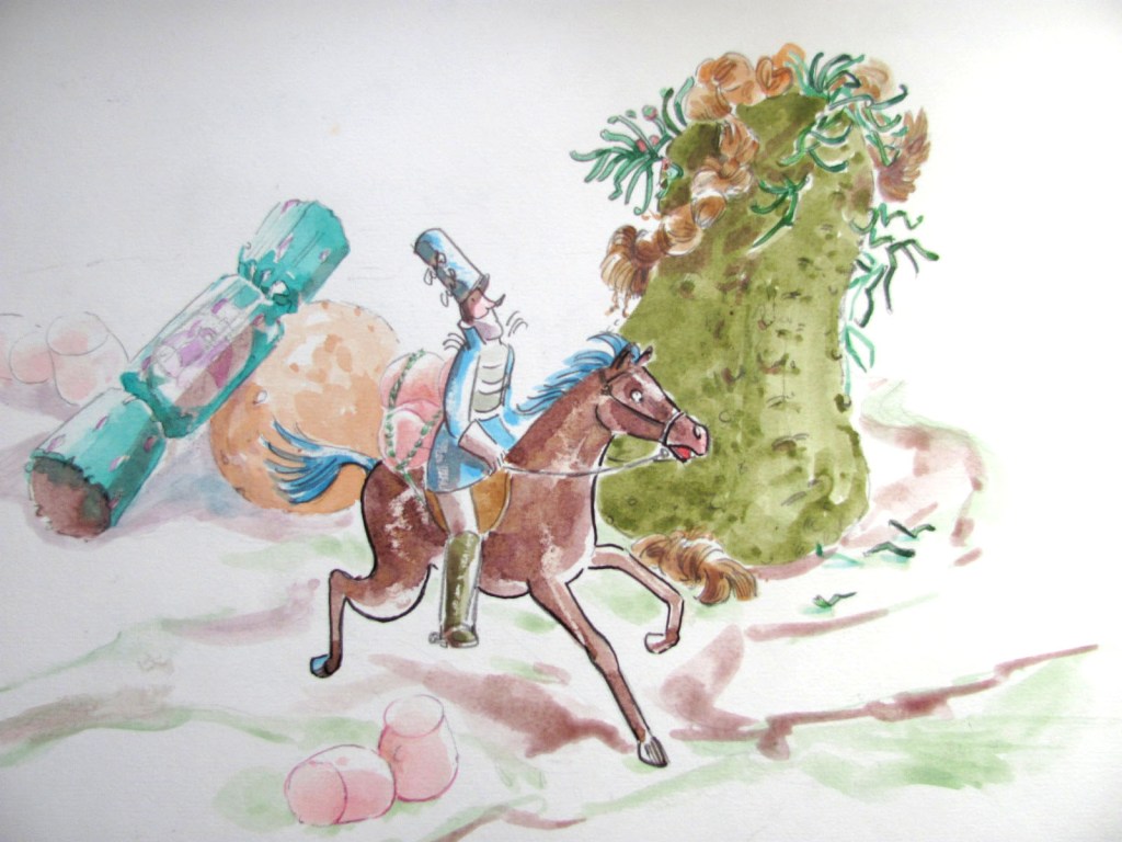 I began to wonder about his earlier life and will upload these ideas in my next post. This illustration with Captain Bower- Sparkle was painted in watercolour and inks on stretched thick cartridge paper. I found applying wax candle and then ink acting as a resist for the horses the best way to depict worn scratched paint.