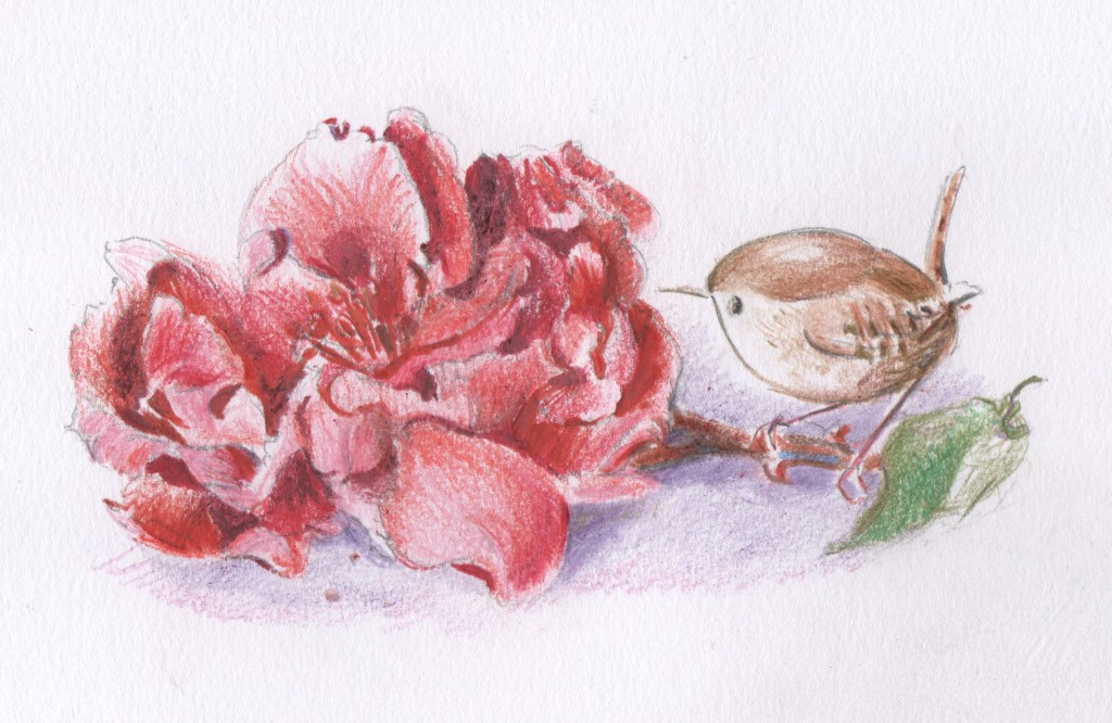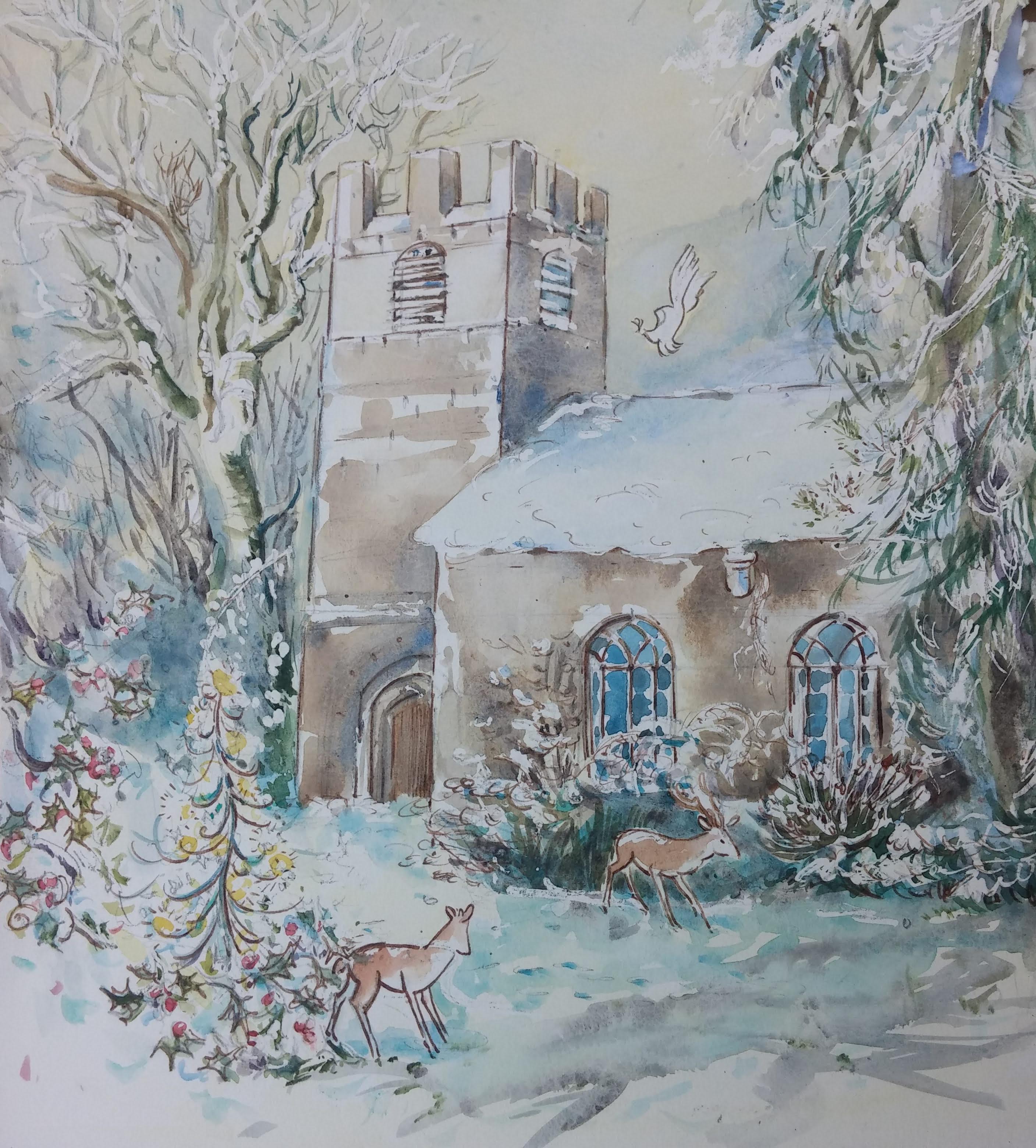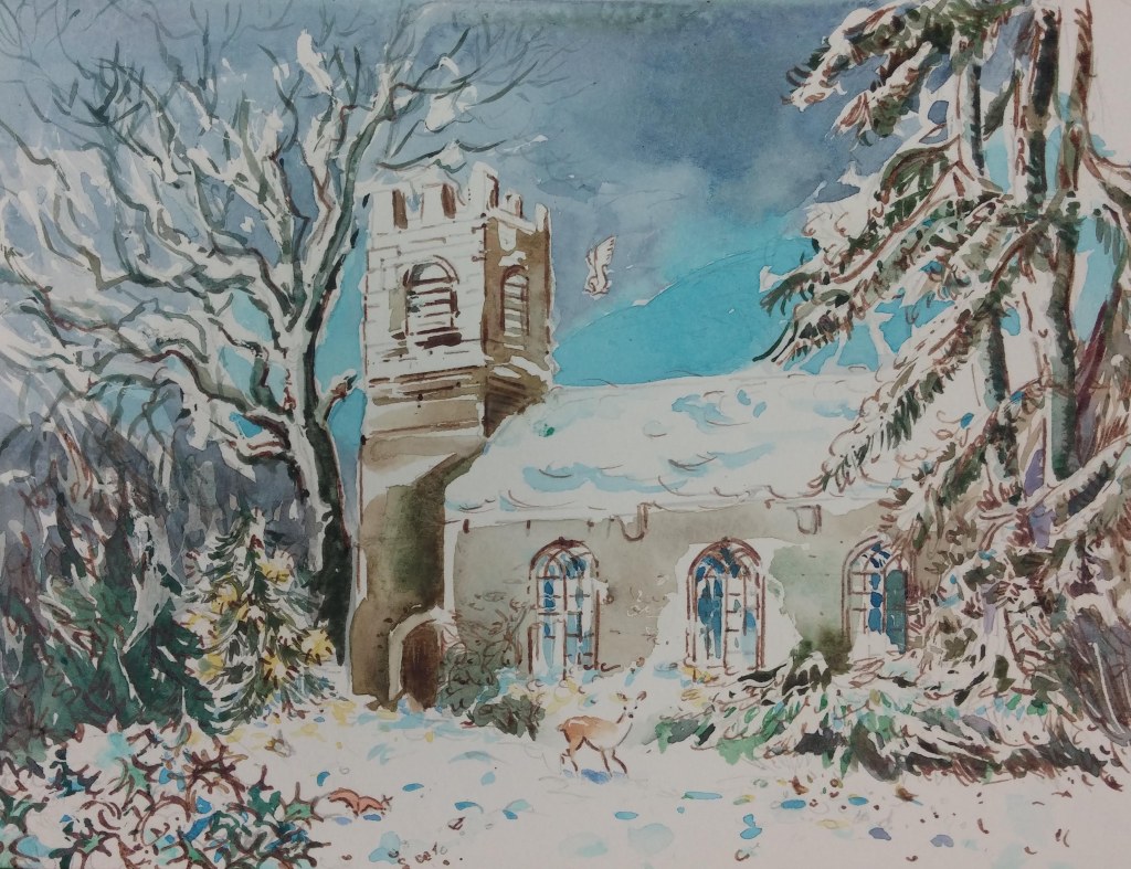 After Christmas I developed an idea for cards based on an owl, fairy lights and snow. Inks are mostly used with the addition of a recent gift (masking fluid). The Church built of sandstone in 1785 replaces the original14th Century Church retaining some interior walls. Its in a lovely spot, also I’m still waiting to be introduced to the black cat I painted a few summers ago.